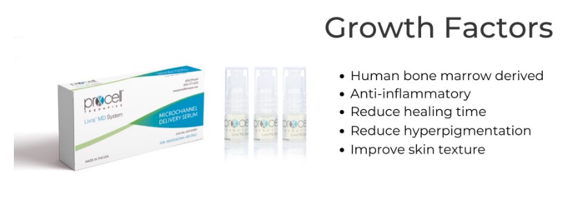 Procell micro-channeling induces new collagen and reduces the signs of aging via stimulation of your own stem cells and the introduction of potent peptides, growth factors and stem cytokines. Micro-channeling stimulates a rejuvenation cascade that your body has build in. The treatment stimulates your skins wound healing response and triggers the release of epidermal growth factors.